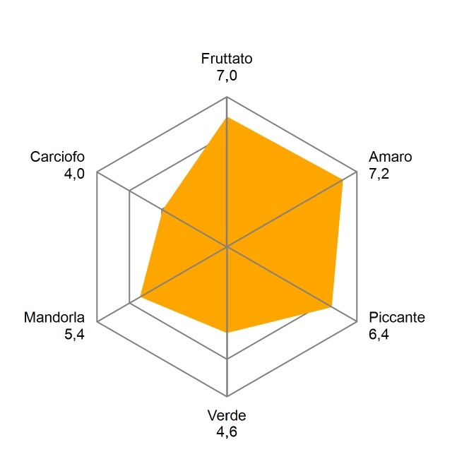 Fruttato intenso, di tipo erbaceo, con sentori di mandorla e carciofo. Note di piccante e amaro di intensita elevata. Polifenoli totali (mg/kg) 1099. Queste sono le caratteristiche del nostro monovarietale di coratina EVO 2021 secondo gli assaggiatori qualificati dell'ASSAM Marche che hanno anche certificato la bonta del nostro Extravergine assegnando il prestigioso riconoscimento di eccellenza alla nostra azienda. L'elevato numero di polifenoli della nostra coratina oltre a conferire il caratteristico amaro e piccante rappresentano a pieno le sue capacita benefiche sulla salute(antiossidante, riduce i radicali liberi e l'invecchiamento). Come avviene da svariati anni la nostra piccola azienda agricola si conferma tra i migliori produttori italiani Scheda valutazione